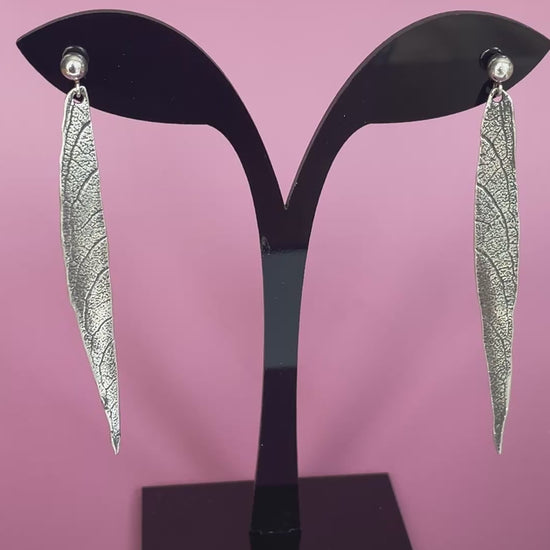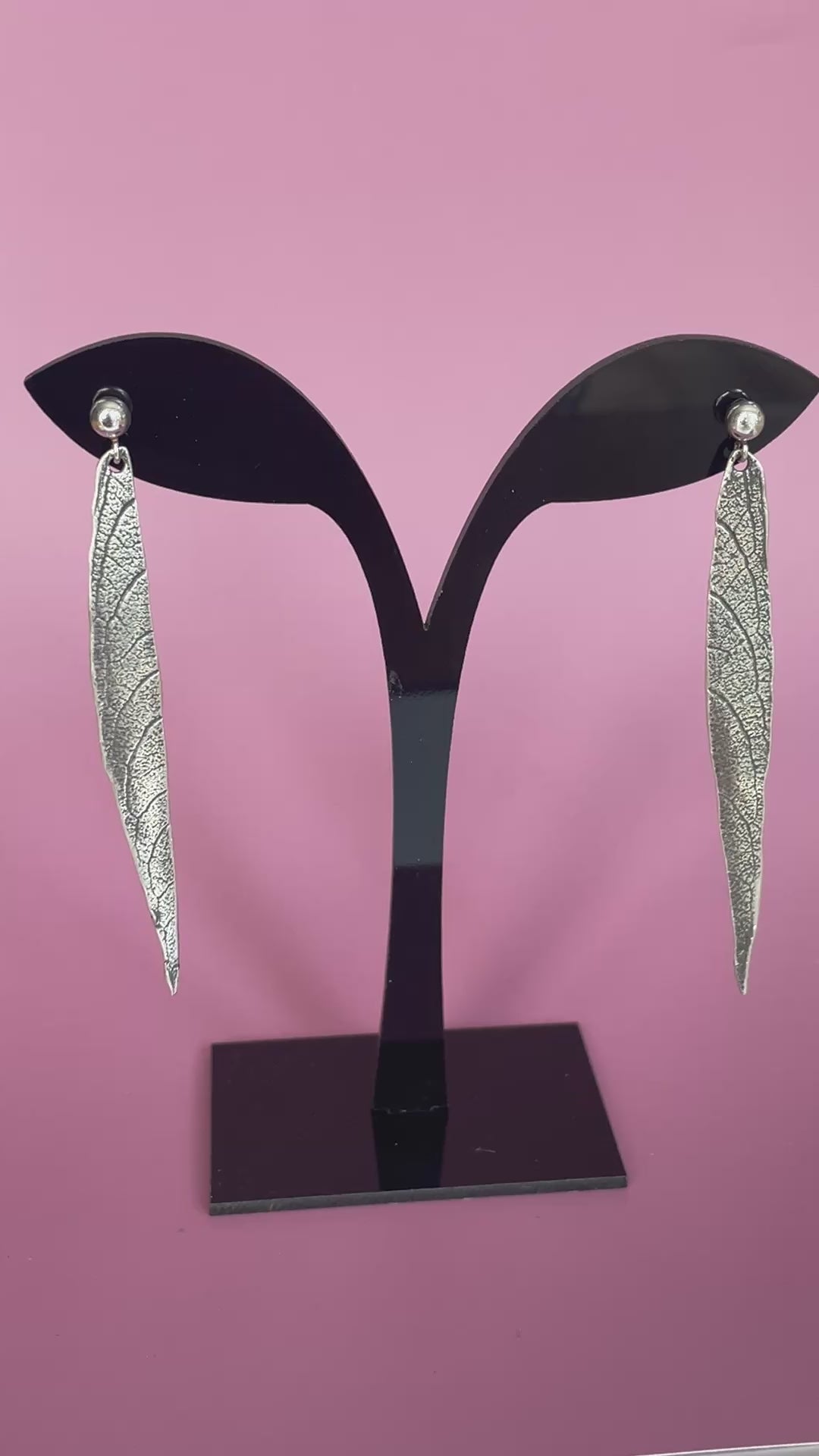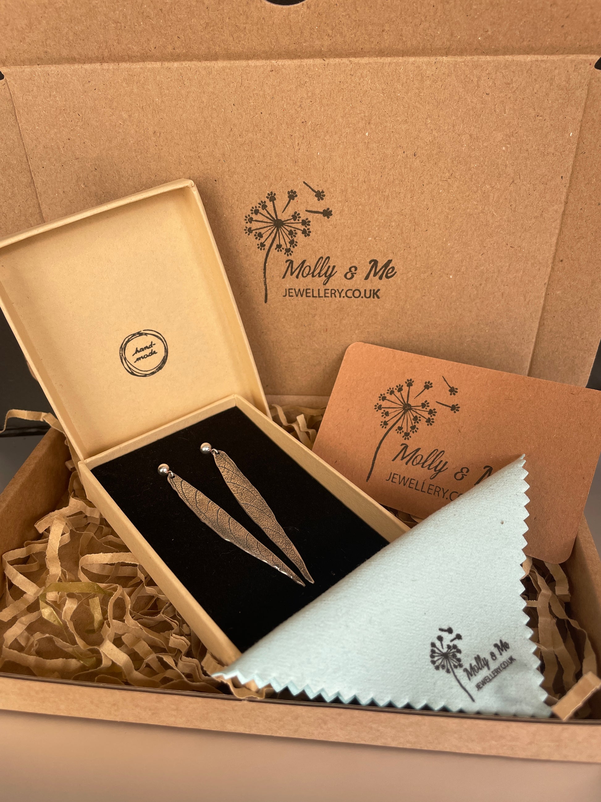 Handcrafted from recycled quality fine silver, these long dangle earrings feature a delicate leaf print from a real leaf. Each pair is unique, adding an element of individuality to your style. These make an unusual and thoughtful gift for anyone who loves nature and the environment. They measure approx 6cm long and 0.7cm at the widest point. The earring posts and backs are made of sterling silver and they weigh just over 2g each, making them comfortable to wear. They come in an eco-friendly gift box, together with a Molly and Me Jewellery cleaning cloth