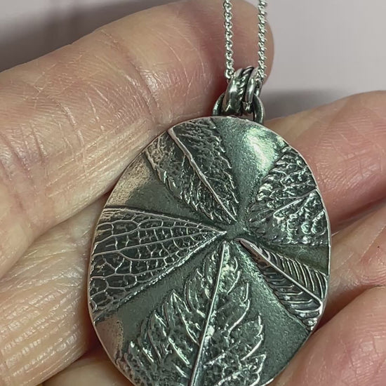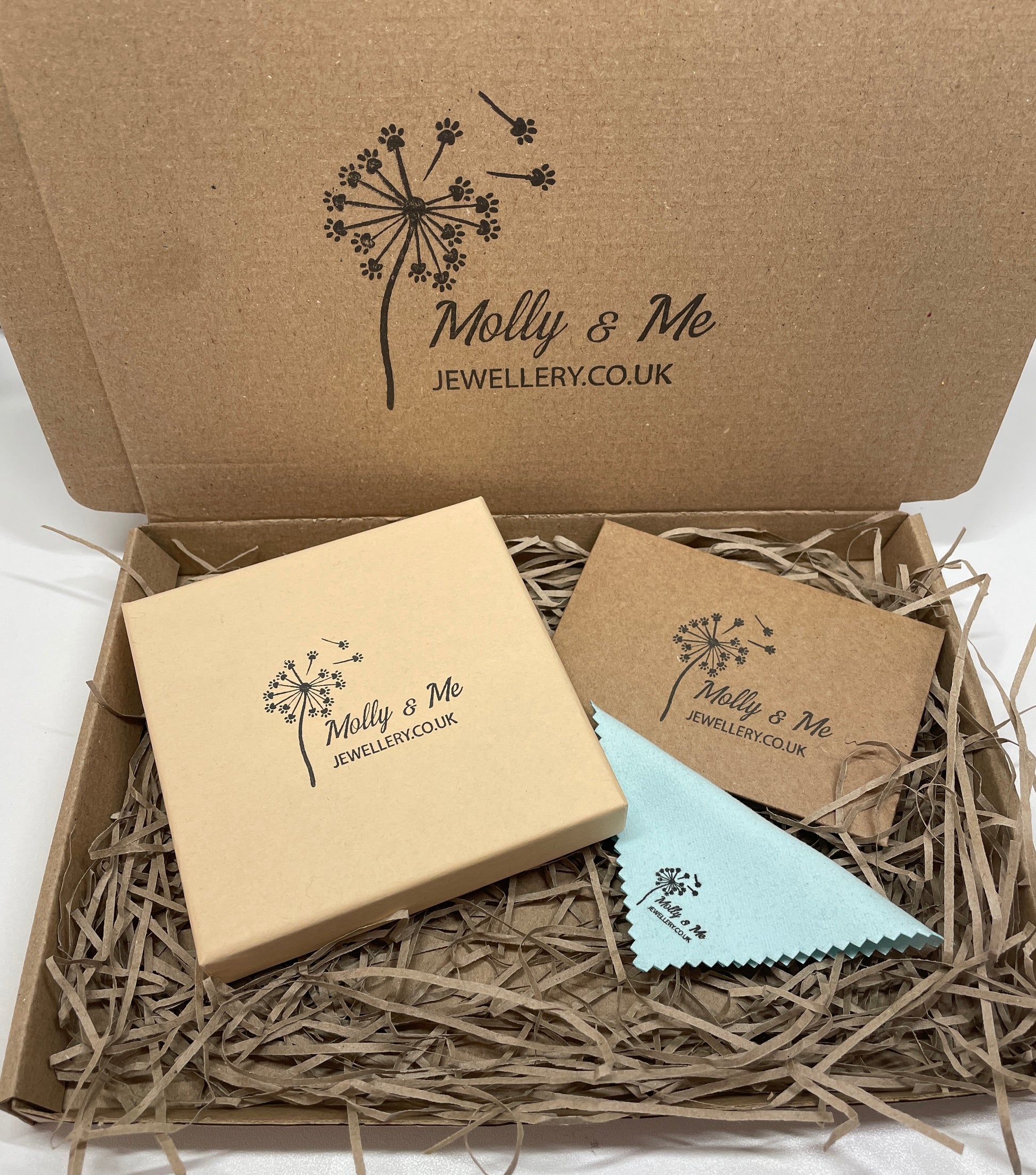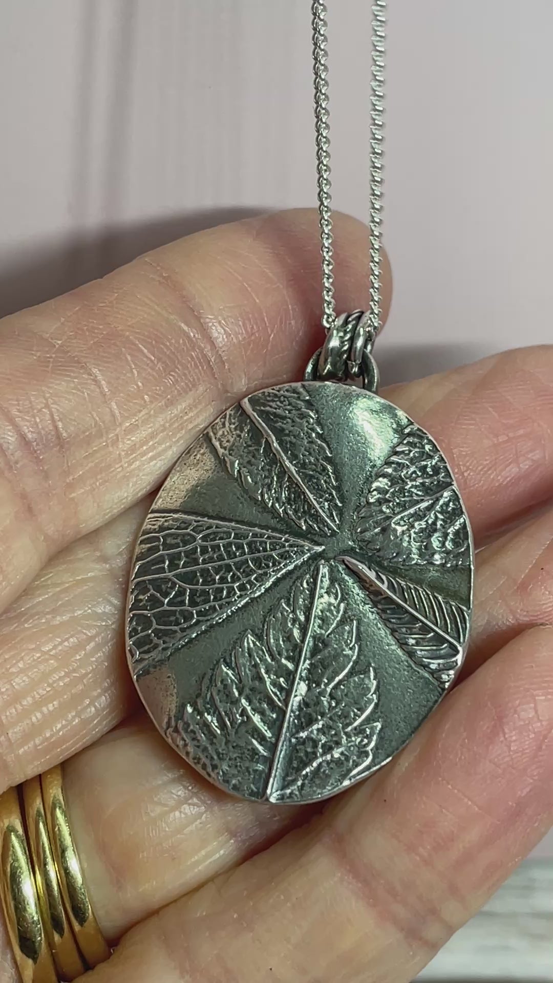 Together with the beautiful 5 leaves on the front of this oval pendant, there is an exquisite bale featuring a leaf and 3 jump rings which adds to the quality and uniqueness of this handformed fine silver piece. Ideal for those that appreciate nature and craftsmanship above mass production, this pendant weighs about 8g and is hallmarked fine silver. It comes in a sustainable FSC gift box and Molly and Me Jewellery cleaning cloth. This 5 leaf oval pendant would make the perfect eco-friendly gift for nature and garden lovers or yourself. Available in a choice of sterling silver chain lengths, the pendant measures 4cm by 2.6cm and has the Molly and Me Jewellery signature paw print on the back.